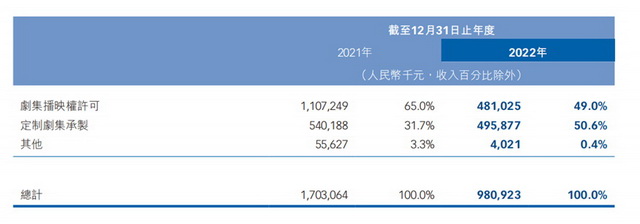 不同于柠萌以版权剧相关收入为主,稻草熊2022年的收入里,定制剧集承制占了大头。2022年,稻草熊影视交付了三部定制剧集,《大考》《请君》和《月歌行》,与2021年保持一致。本集团定制剧集承制业务产生的收入亦与2021年保持相对稳定,截至2022年12月31日止为人民币4.9亿元,与去年相差不大,且收入占比从去年的31.7%飙升至50.6%。