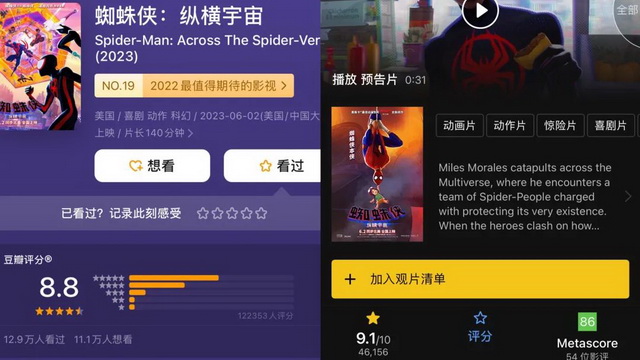 豆瓣8.8、IMDB 9.1——尽管前作《蜘蛛侠:平行宇宙》已是珠玉在前,横扫当年一众国际电影节动画电影奖项,可《蜘蛛侠:纵横宇宙》还是在口碑上实现了对前作的全面超越——要知道,上一个能在国内达到如此口碑高度的好莱坞电影已经得追溯到2017年的《寻梦环游记》了。
