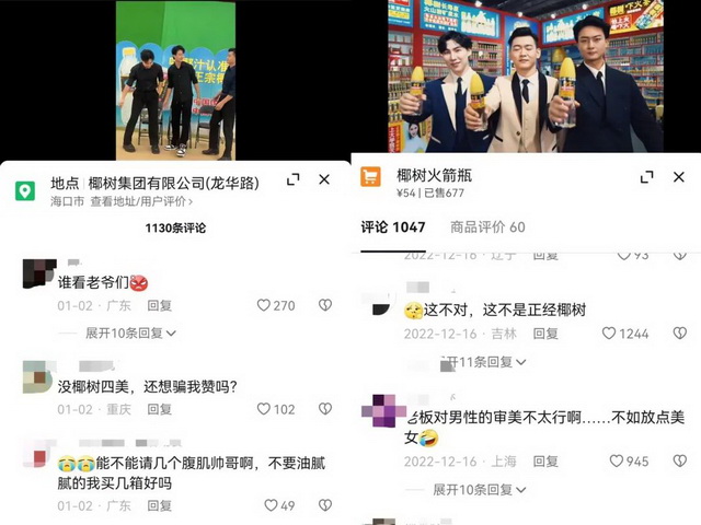 六月一日椰树的线下直播更是大肆发酵。那几日,在商场“六一童心飞扬”的展示板前,男模们欢快地扭动着身姿骑动感单车,对着火箭瓶造型贴身热舞的视频传遍了微博。
