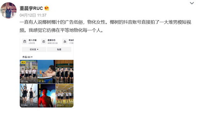 男模团、女模团的表演,不仅带火了“椰树审美”火了之后,还火了另一句话,“椰树在平等物化每一个性别”。言外之意,徐冬冬那一套形象和延伸的性感美女符号,在椰树已经过时了,现在,我们有了男版的“徐冬冬”。椰树不仅有性感美女,还有性感男性。