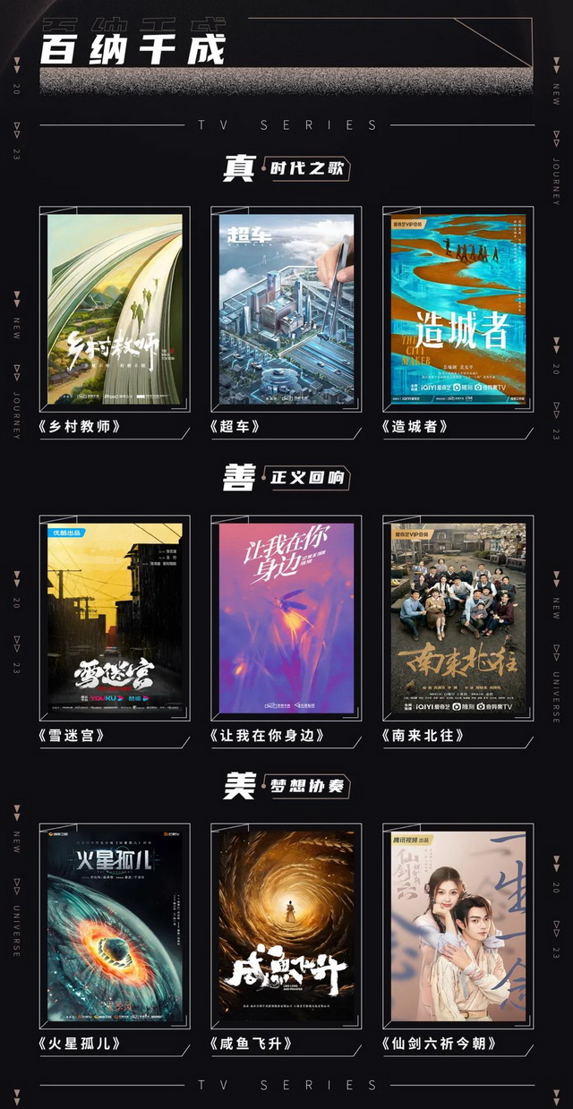 百纳千成经过扩张与整合,将剧集业务分归于六大厂牌。在发布会上,百纳千成用“时代之歌”、“正义回响”、“梦想协奏”三个部分,展示了聚焦“真善美”的剧集内容核心以及来自六大厂牌的九部待播作品,从现实题材、悬疑犯罪等传统类型,到科幻、男频修仙等创新类型均有涉猎。