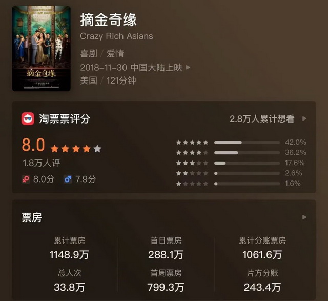 但效果确实达到了。北美的评论认为《摘金奇缘》对亚裔的意义来说就像黑豹对黑人社群一样,对少数族裔是灯塔,对好莱坞所有那些说不能或不应该这样做的人则是一记大而闪亮的中指。