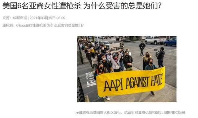 2021年美国当地时间3月16日,亚特兰大发生一起连环枪击案。一名21岁的白人男子接连袭击三家按摩院,造成8人死亡,其中包括6名亚裔女性。之后这起枪击案,引发了纽约、芝加哥、亚特兰大等全美多个城市爆发“停止仇恨亚裔”抗议游行和集会。