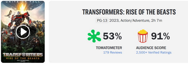 从口碑来看,《变形金刚7》的烂番茄新鲜度低至53%,与《速度与激情10》(56%)处在相同层级,但仍远高于系列第2至5部,主流媒体对片中的人类角色更为认可;同时《变形金刚7》的爆米花指数达到91%,再加上IMDb上的6.6分(1.6万个评价),显示观众对影片仍持正面态度。