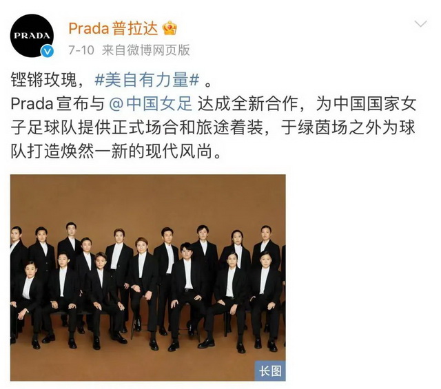 中国足球队官方微博也写道:“Prada成为中国国家女子足球队官方正装合作伙伴,将于绿茵场外为球队打造焕然一新的现代风尚。”