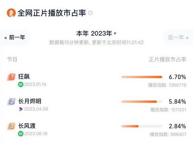 总播放量提升的同时,2023年上半年的国剧市场也有了近几年数据最好的剧王《狂飙》。德塔文、灯塔专业版、猫眼专业版、云合数据……基本上所有的数据平台,《狂飙》都是毫无疑问的第一。在云合数据的脱水统计里,《狂飙》也是在《庆余年》后又一部“百亿播放量俱乐部”的成员。