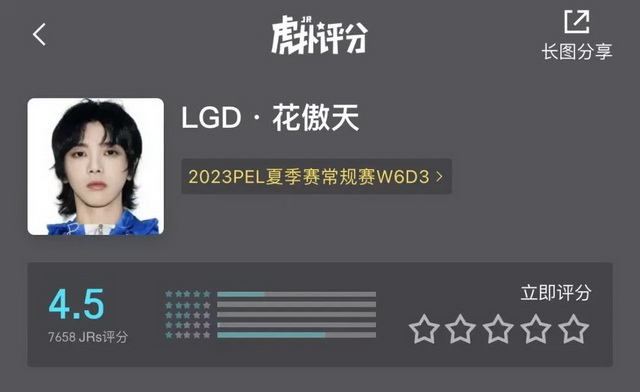 这种技战术层面的细节,往往是区分职业选手与高分路人的关键。在虎扑《和平精英》分区的赛后评分中,花傲天仅4.5分,而其队友均在9分以上。这已经粉丝控评之后的结果,点开评分界面可以看到,花傲天的评分基本只有5星和1星两种,被大量点赞的前排评论有不少是原封不动复制粘贴的。