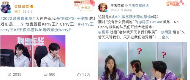 对于头部电竞赛事而言,在已经有庞大受众基础的情况下,保持品牌调性更加重要。这些赛事也有不少的签约代言人。诸如王俊凯、杨幂等明星,也是这些游戏多年以来一直广为流传的“高分路人”。但这些明星对赛事的参与,始终被框定在娱乐赛、表演赛的层面,从来不曾真正打破其与职业选手之间的边界。