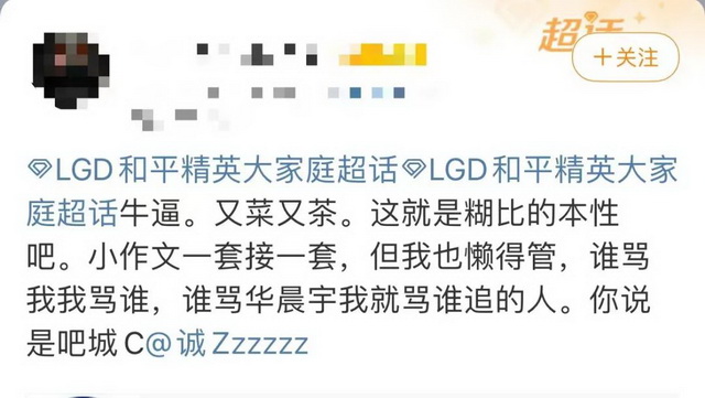 更大的危机来自于LGD的另一名队员诚C,其本身也是PEL的头部明星选手之一。因华晨宇粉丝在诚C的直播间刷屏导致被房管封禁,诚C本人遭到了华晨宇粉丝的疯狂辱骂。不少华晨宇粉丝将其在LGD的队友都称之为“陪玩”,这进一步放大的竞粉与花粉之间的矛盾,在花傲天正式登场前已然势同水火。