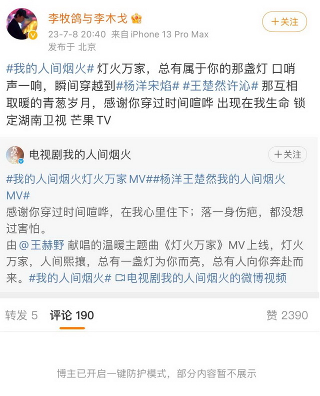 不过,必须给杨洋粉丝说句公道话:在杨洋接这部戏的消息出来之后,他们曾经在官博下集体抵制过这部剧,毕竟原作者玖月晞的“融梗”争议实在太过出名,没人愿意让自家爱豆和这类风评较差的IP扯上关系。可惜的是粉丝没能“撕”掉这部剧,还得在《人间烟火》播出之后努力做数据控评。