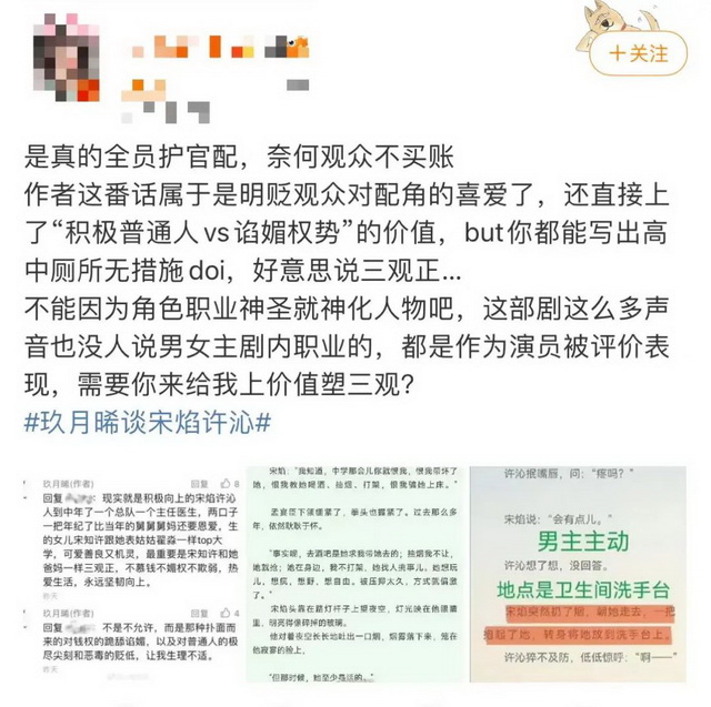 最“精彩”的还是原作者玖月晞。她在微博对骨科线和孟宴臣的走红表达了直观的不满,称其是“扑面而来的对钱权的跪舔谄媚”“对普通人极尽尖刻和恶毒的贬低”,还直接给男女主描绘了“一个总队一个主任医生”“生的女儿top大学”的美好未来。
