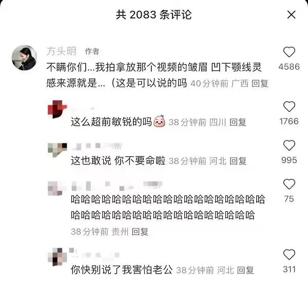 有趣的是,近期方头明在评论区表示,视频里硬拗下颌线的动作灵感来源,就是杨洋在《你是我的荣耀》中的表演片段,两者形成了绝妙的互文。