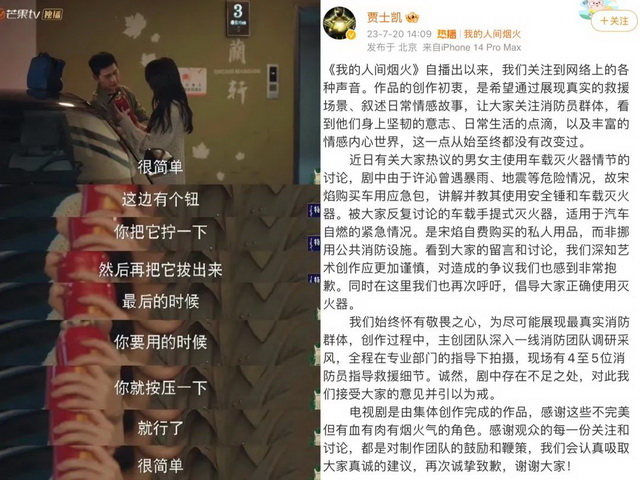 这段剧情被潮州消防救援支队官博点名批评,发视频科普其中灭火器使用的错误,剧的出品人兼杨洋经纪人贾士凯不得不出来发文道歉,解释剧中男主的灭火器是私人购买,不是挪用公共消防设施。