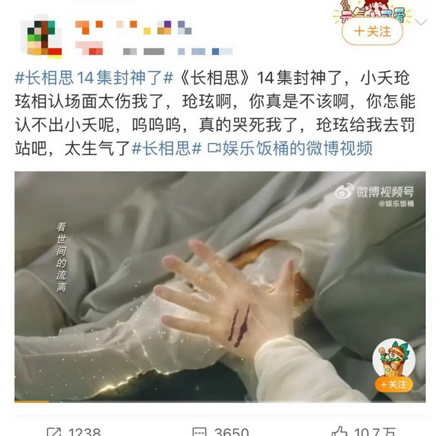 另一边短视频平台,《长相思》未正式播出前,根据片花预告剪辑而成的虐恋视频就已经有点赞3万,60万播放量的数据,在破千的评论里,大多是对虐恋骨科的长篇文字分析。