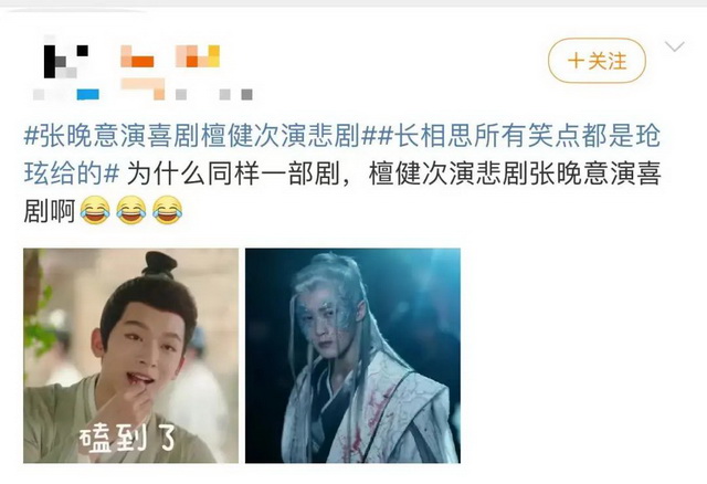 例如,微博上,《长相思》的“夭玹”CP粉热衷于在情节中挖掘笑点,在广场上各种玩梗造梗,“玱玹你怎么不笑了”、“玱玹被自己射出的子弹正中眉心”、“张晚意戴墨镜cue玱玹瞎”等话题保持千万阅读量,而这些看似戏谑的话题词,其本身就已经有了一些再创作的味道。