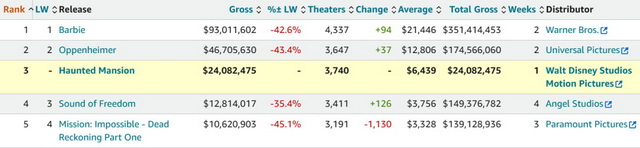 据The-Numbers统计,《幽灵鬼屋》在零点场进账310万美元,比两年前的《丛林奇航》(270万美元)略优。随后《幽灵鬼屋》铺开至北美3740家影院,首周末报收于2408万美元,单馆收益仅为6439美元,排在《芭比》和《奥本海默》后居季军。