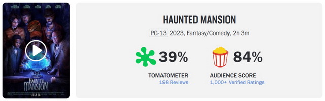 从口碑来看,《幽灵鬼屋》的烂番茄新鲜度低至39%,影评人表示其“既不恐怖也不搞笑,不足以全心推荐”,但还是肯定“才华横溢的演员阵容”;即便爆米花指数为正向的84%,叠加IMDb上平庸的6.3分(4.2千个评价),《幽灵鬼屋》的两极评价对后市恐成隐忧。