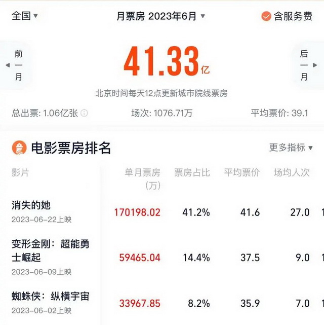 其中,超级爆款《消失的她》贡献最大,票房占比为41.2%,排在其后的是好莱坞大片《变形金刚:超能勇士崛起》和《蜘蛛侠:纵横宇宙》,占比分别为14.4%和8.2%。《消失的她》力压好莱坞大片并非罕事,进口分账片票房逐年走低已是常态,再加上《消失的她》话题讨论度高居不下,好莱坞大片优势更少。