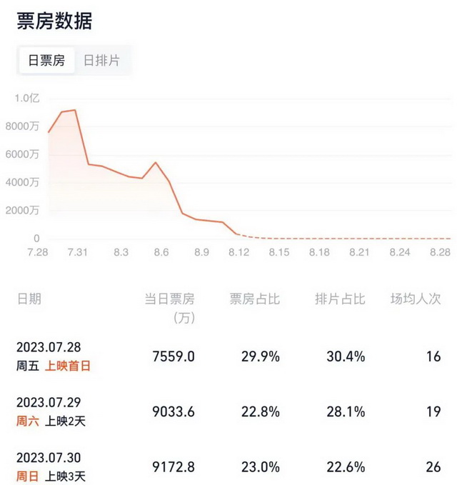 虽然7月的国产片不缺逆袭的故事,但也有例外。大鹏执导的新片《热烈》映前预期颇高,但上映首日,票房占比29.9%微微低于排片占比30.4%,上座率只有11.8%,市场表现不佳,票房预测也从此前的16亿到23亿区间降至10亿。更可惜的是,原本以为可以长线放映,走出上扬票房曲线的《热烈》,在8月遇到了更大的挑战。