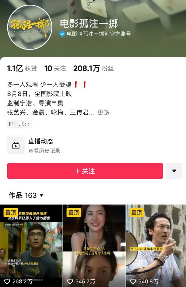 根据QuestMobile数据显示,2023年5月短视频月活跃用户规模达到9.58亿,且保持流量增长,不断扩充的用户群为电影营销提供了可以大展身手的战场。早在6月,《孤注一掷》已经开始在抖音平台提前预热。账号发布的第三条视频收获不俗成绩,“金晨演绎美女荷官”视频有86.5万点赞,3.7万评论,之后账号陆续放出电影情节物料,细致境外诈骗的洗脑与凶残,播放量持续走高,其中,“王传君再现洗脑名台词”成为账号爆款,有540.8万点赞。