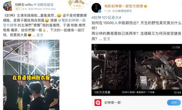 为了响应“自来水军”,片方迅速调整宣传方向进行配合。7月29日,官方放出纪录片,曝光幕后质子团的演艺训练过程,既满足观众对于质子团的好奇,也让观众对电影幕后的长期筹备产生情感认同;另一边,片方听进去网友建议,8月8日安排封神质子团到刘畊宏直播间跳操,当晚“封神主创团做客刘畊宏直播间”冲上热搜,引起微博2.4万讨论。