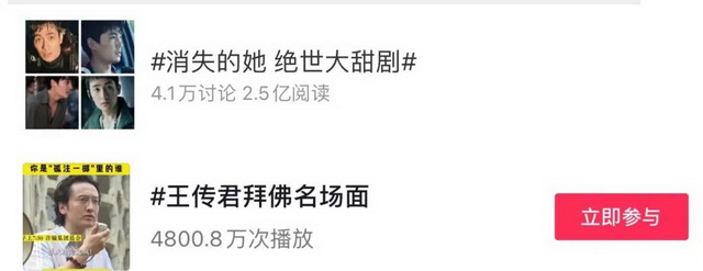今年比较明显的一个现象莫过于暑期档电影的讨论较以往增多,相关话题频繁推至社交平台热搜榜前列。前有《消失的她》话题“消失的她 绝世大甜剧”登至微博热搜榜第二位,阅读量高达2.5亿,后有《孤注一掷》“王传君拜佛名场面”在抖音引网友模仿,累计播放量4800.8万。