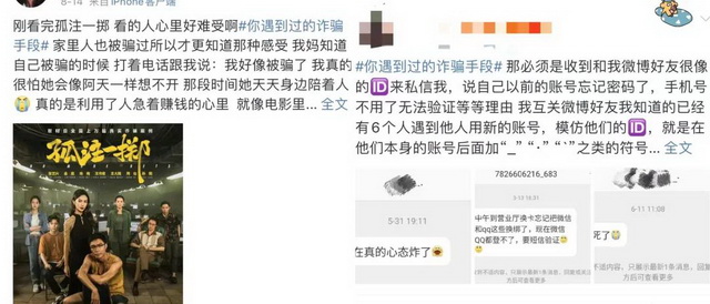 超高票房成绩背后,是《孤注一掷》对现实精准的洞察与判断。电影首次将诈骗产业链内幕搬到大银幕上,对不同类型的受害者的受骗经历进行了细致刻画,让观众代入其中,产生强烈的情绪。微博上,伴随着电影热映,“反诈”话题热度走高,“你遇到过的诈骗手段”、“看完孤注一掷你想起了谁”等相关话题下,网友从自身经历出发讲述诈骗经历,强烈的表达欲背后在于电影切合了近两年日益高涨的“全民反诈”社会氛围。