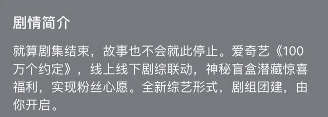 《100万个约定》的简介很好地体现了这一点:被节目囊括进售后范围的,是“预约”热度高的剧集。等到剧集上线,按照平台预期播出,再顺势推出综艺,满足观众对剧集之外演员互动、衍生内容的需求,完成IP矩阵的拓宽。