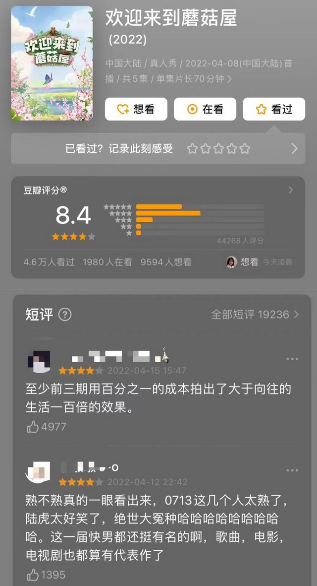 表面上看,成本低,很适合追求轻体量的“剧集团建”。但你不能而排除它的特殊性,《欢迎来到蘑菇屋》请到0713男团能成功,一是因为他们整体太熟,有熟人综艺的化学反应,二是性格跳脱资历深,闯荡娱乐圈的经验不管好的坏的都挺丰富,能支撑起综艺效果。实际上《蘑菇屋》一共五期,0713只来了三期,后面两期是芒果自家的《名侦探学院》嘉宾,综艺效果远不如前三期,除了粉丝以外也没什么大众知道。