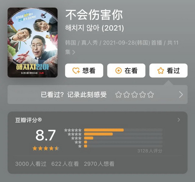 比较经典的例子,是韩剧《顶楼》的“团综”《不会伤害你》,节目找了剧里的三位反派演员,把他们扔到废弃屋子里“自力更生”,做房屋改造,有种看剧里的反派坏人吃瘪的快感,被网友评价为“坏男人变形记”,最终综艺在豆瓣也收获了8.7的高分。