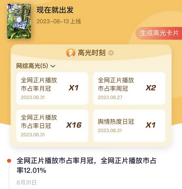 基于这样的思路,腾讯视频至今为止推出了多样的、符合观众情绪的综艺。艺恩数据显示,在刚刚结束的2023年第二季度里,腾讯视频的《舞台2023》《心动的信号6》《战至巅峰2》等五部综艺霸榜了播映指数TOP10榜单。《现在就出发》在腾讯视频站内的热度值突破了综艺历史最高,也以12.01%的正片播放市占率登顶了灯塔专业版数据的8月月榜。