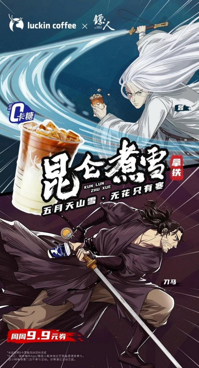 体量增长之外,还出现了更令人惊喜的风格化作品。比如豆瓣评分8.7的《镖人》,用2D粗粝质感的武侠美学,给国产动漫带来了一道别样的风景。口碑上的成功,也显著带动了其在商业化层面的影响力。《镖人》与肯德基、锐澳、瑞幸、鬼塚虎等九个品牌进行了深度联动,粉丝都纷纷在社交平台晒单二创。