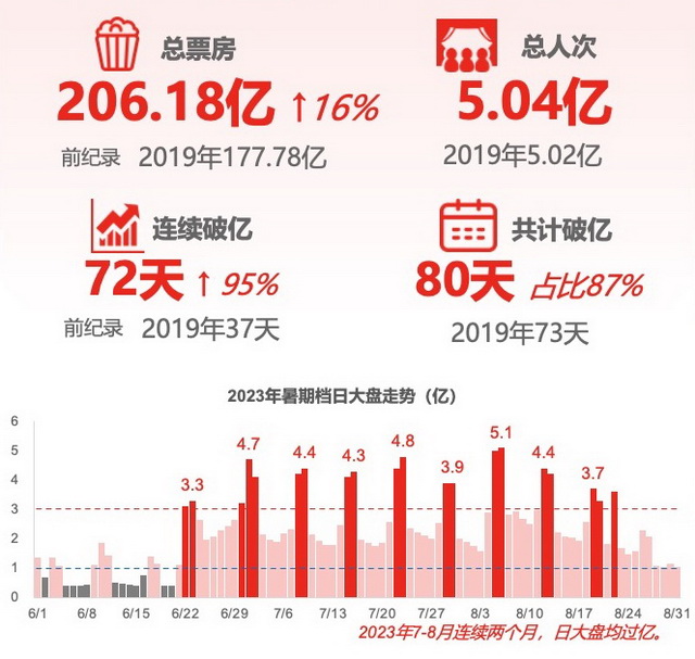 今年暑期档以总票房206亿的成绩,打破2019年暑期档177.8亿纪录,并且增长了16%。