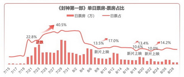 在票房增长上,今年最明显的趋势莫过于长尾效应更加明显。《封神第一部》通过口碑大规模发酵,上演翻盘奇迹,上映三周,经历三轮新片上映冲击,单日票房仍保持在10%以上。