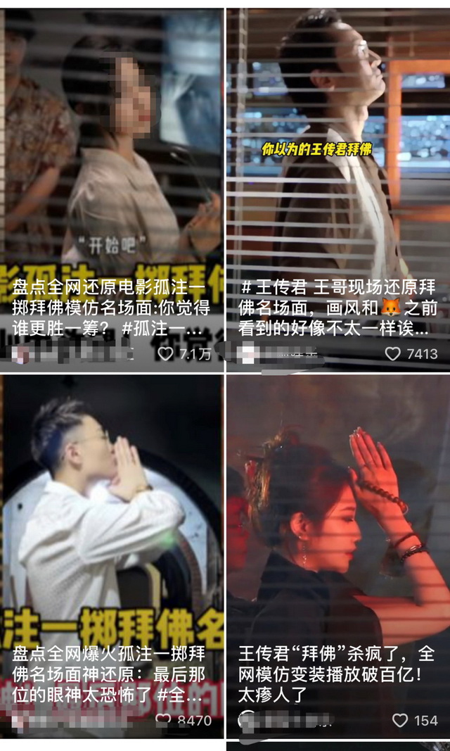 短视频的病毒式传播让电影热度呈指数上升,下沉市场红利出现,助推票房步步高升。《孤注一掷》里,“王传君拜佛”的镜头引起头部达人争相模仿,热点视频总点赞超过2300万次,让电影未映先火。