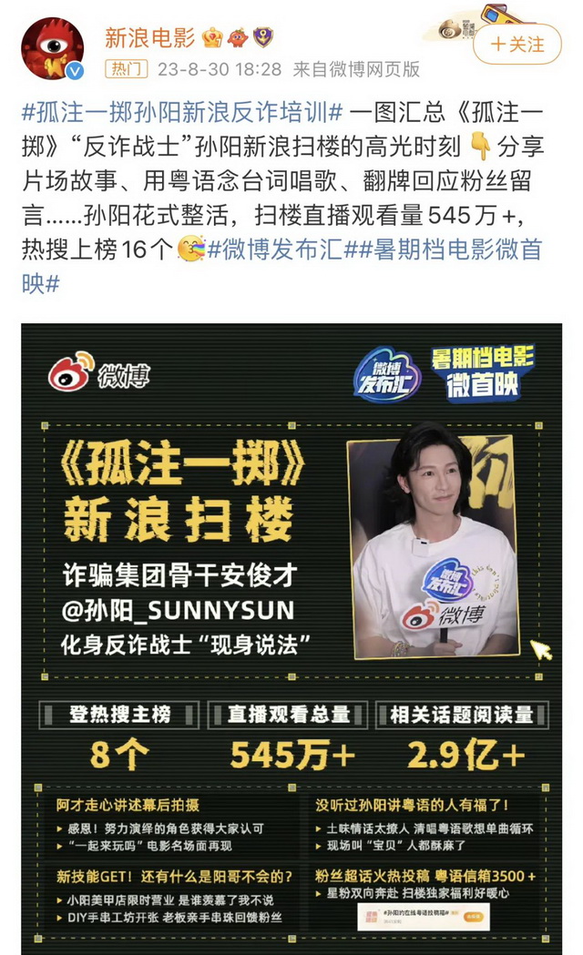 同样,在《孤注一掷》里凭借阿才一角走入大众视野的孙阳人气也直线上升。一周涨粉21.5万;新浪扫楼活动中,登8个热搜主榜,直播观看总量545万,相关话题阅读量超2.9亿。