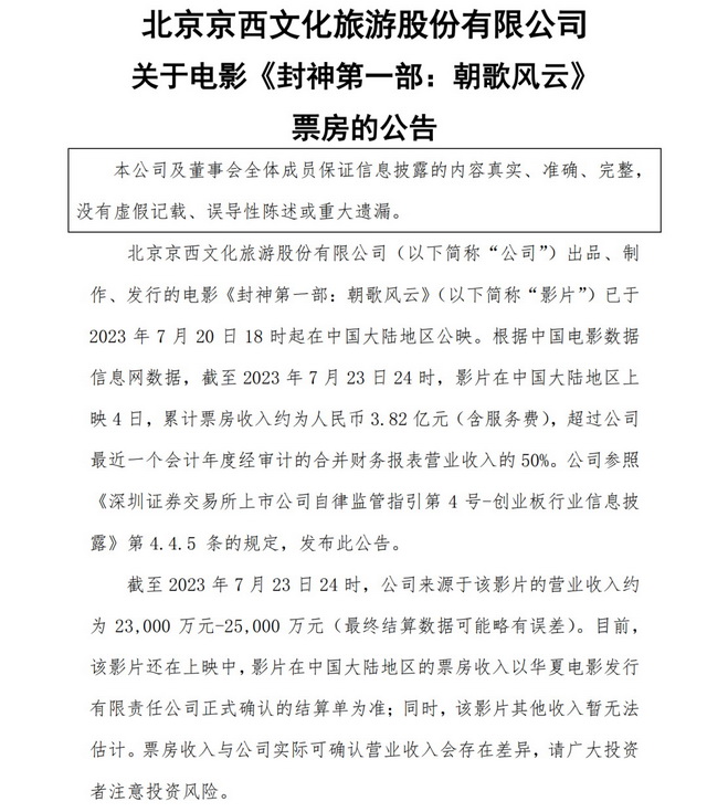 7月24日,北京文化发布公告称,截至23日,电影票房3.82亿,公司营业收入约为2.3-2.5亿,约占票房收入的60%-65%。在北京文化2022年的年报问询函中提及,《封神》项目账面资产余额为16.55亿,被计入“其它应付款”的“固投款”7.1亿也体现为成本,因各公司会计准则不同,是否计入16.55亿中不得而知。但即便如此,目前来说,《封神第一部》25亿的成绩,能让北京文化转危为安依旧难说。