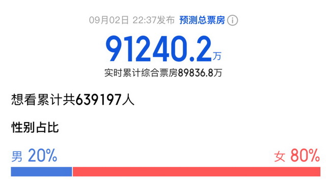 万达影业出品的《热烈》,映前市场预期颇高。题材年轻化,导演大鹏有成熟商业片执导经验,主演黄渤王一博,符合“戏骨+流量”的固定搭配。可惜最终市场表现低于预期,猫眼预测票房下调到9.1亿。猫眼专业版显示,用户画像男女比例失衡,女性群体占80%,还是有明显的粉丝电影的用户逻辑。