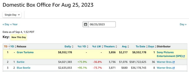 另据《综艺》杂志报道,在索尼将《GT赛车》的公映日期从11号推迟两周后,其间举行了多轮点映并产出约390万美元,这笔票房被索尼合并算到影片的开画数字中,但这一做法招致华纳兄弟不满,后者声称单以周末计《芭比》才是冠军。