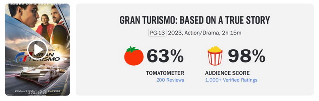 从口碑来看,《GT赛车》的烂番茄新鲜度为61%,主流媒体表示其基于事实的故事讲述稍显松散,但总体上不失为一部扎实的赛车电影;而《GT赛车》的爆米花指数更达到98%,足见原游戏粉丝对此次改编持肯定态度。另外《GT赛车》在IMDb上得到7.4分(共1.4万个评价),将为后市提供一定势能。