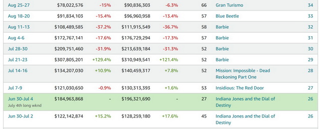 相比之下,《奥本海默》和《碟中谍7》双双下滑逾10个百分点,为前十名中受创最深的影片。总体而言,偏向家庭或年轻观众的电影获益更明显,而定位成人和大龄群体的影片反倒被分流。