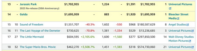 值得一提的是,《侏罗纪公园》在公映30周年之际重返大银幕,在1224家影院拿到170万美元,压过海伦·米伦领衔的《歌尔达》,双双进入票房榜前15名;瞄准为“影院日”而来的家庭客流,《小美人鱼》和《超级马力欧兄弟大电影》分别扩增1560家和1383家影院,周末票房也大涨约21倍和35倍,比预估时公布的18倍和21倍尤有提升,累计则迫近2.98亿和5.75亿美元。