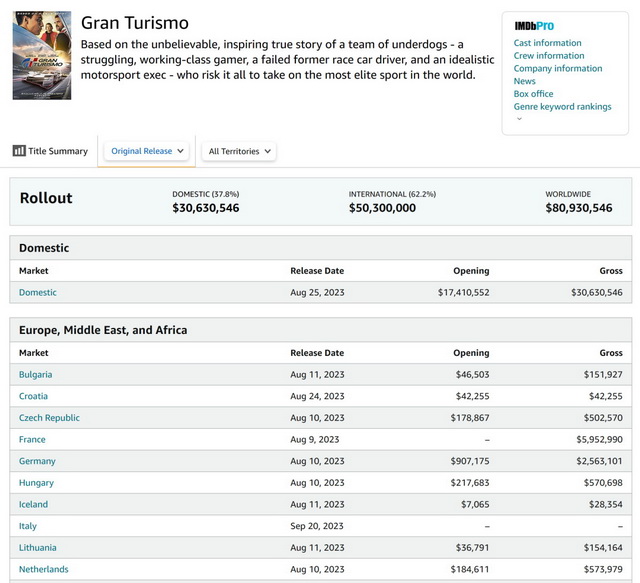据Comscore统计,《GT赛车》共登陆62个国家和地区,海外周末票房超过1千万美元,推动全球达到5391万美元。其中,《GT赛车》在法国(431万美元)、英国(246万美元)、澳大利亚(221万美元)、墨西哥(220万美元)、德国(190万美元)和西班牙(131万美元)等地表现出色。