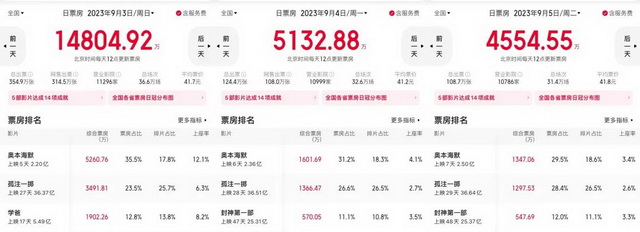 早在海外市场上映一个月的《奥本海默》,如今累计票房已有8.8亿美元,成为影史第二部破8亿美元的R级片,这也是诺兰导演生涯票房第二高的作品。北美市场的火热延续到了大陆市场。上映三天票房破亿,豆瓣评分从8.7上涨到8.9,在排片低于《孤注一掷》的情况下,连续4天夺得票房日冠,猫眼最后预测票房上涨到了4.18亿。