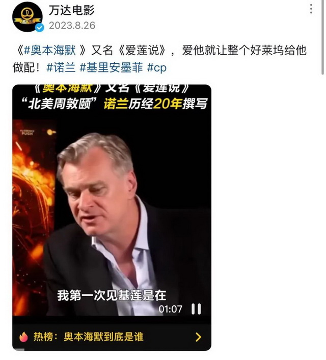 虽然,目前短视频宣发套路仍然陈旧,无法开拓出新思路,触及到更广泛的普通观众,但是得益于短视频的传播力,诺兰相关片段在二创中渐渐有了一定话题度。因为诺兰在各种场合大赞男主基里安·墨菲,粉丝戏称“爱莲说”,相关CP剪辑在这段时间重新有了热度。一套组合拳下来,《奥本海默》的三四线城市票房超过了40%。