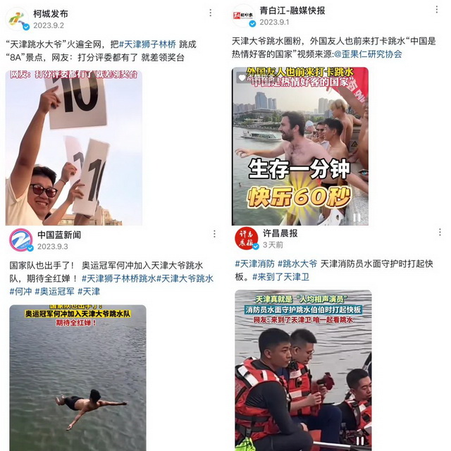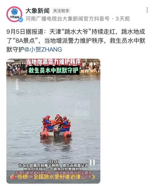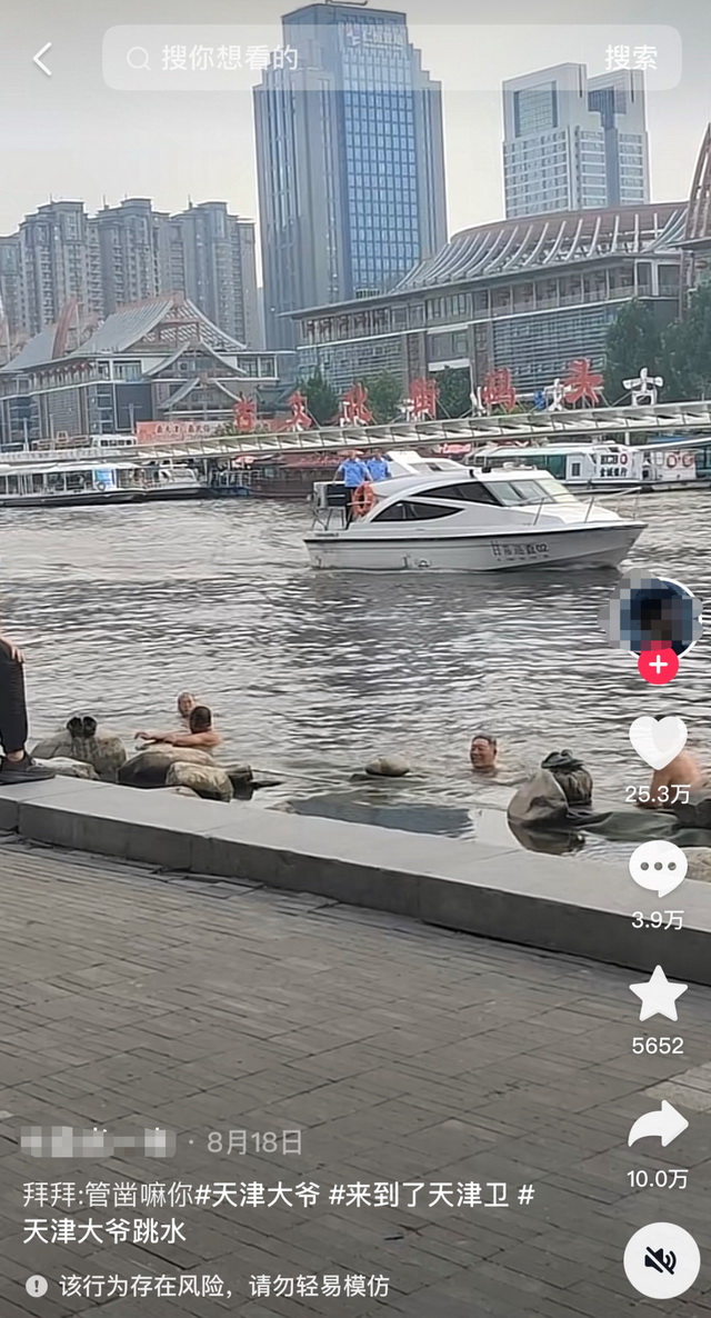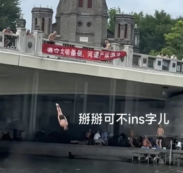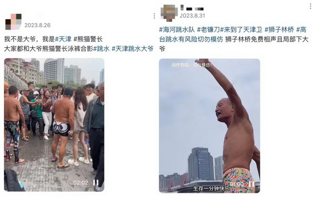 这一批追捧“伯伯跳水”的热潮始于八月下旬。当时有网友在短视频平台上传天津伯伯跳水的视频,此时正值泄洪结束,天津市内部分水域开始解封,狮子林桥就是其中一处。