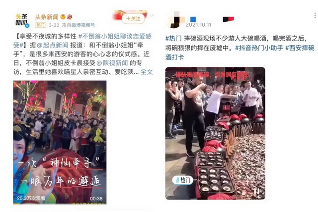变化出现在2017年底,这一年抖音刚刚面世一年。有网友在抖音上传了一段15秒的西安摔碗酒视频,获赞上千万,后续引发第一波的西安旅游热,人们蜂拥而至,摔出了上百万碗的“西安摔碗酒潮”。