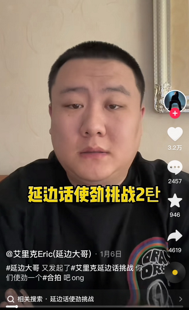 “呀,今天天气真天气,ong?”抖音博主@艾里克模仿延边本地人说话的系列视频,在抖音收到百万点赞,众多网友聚集在艾里克视频评论区,一众讨论着延吉这个遥远而神秘的城市。