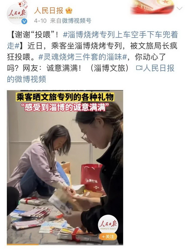 比如备受好评的淄博,在烧烤火了之后,当地政府反应相当迅速。增加21列烧烤专列,在高铁上免费发放淄博产的苹果以及当地各种文旅产品,让游客们“空着手来提着兜走”,甚至当地文旅局长也登上高铁“揽客”。