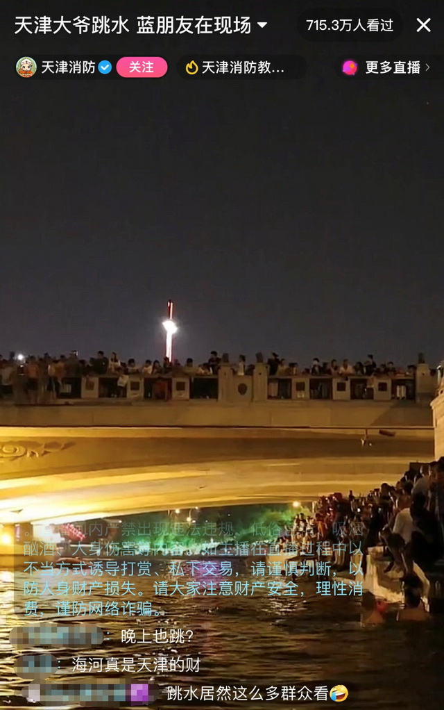 在爆火的狮子林桥背后,我们也能看到,当地政府在人群跳水时没有“一刀切”,而是备齐警力加强保护、引导。天津消防在河边值守夜班的同时,也开启抖音直播与观众热聊。